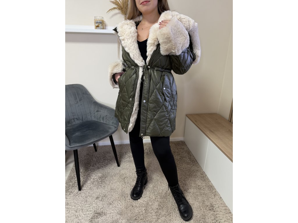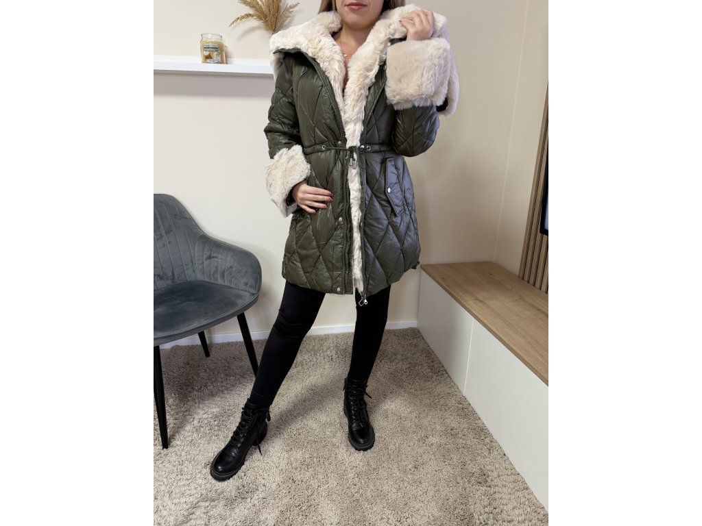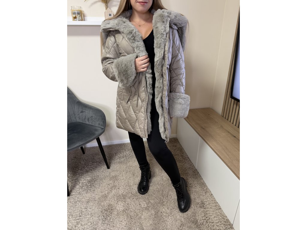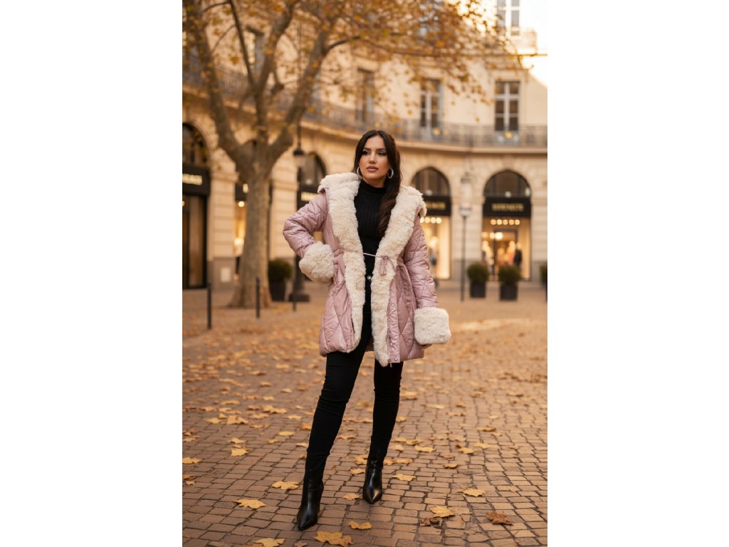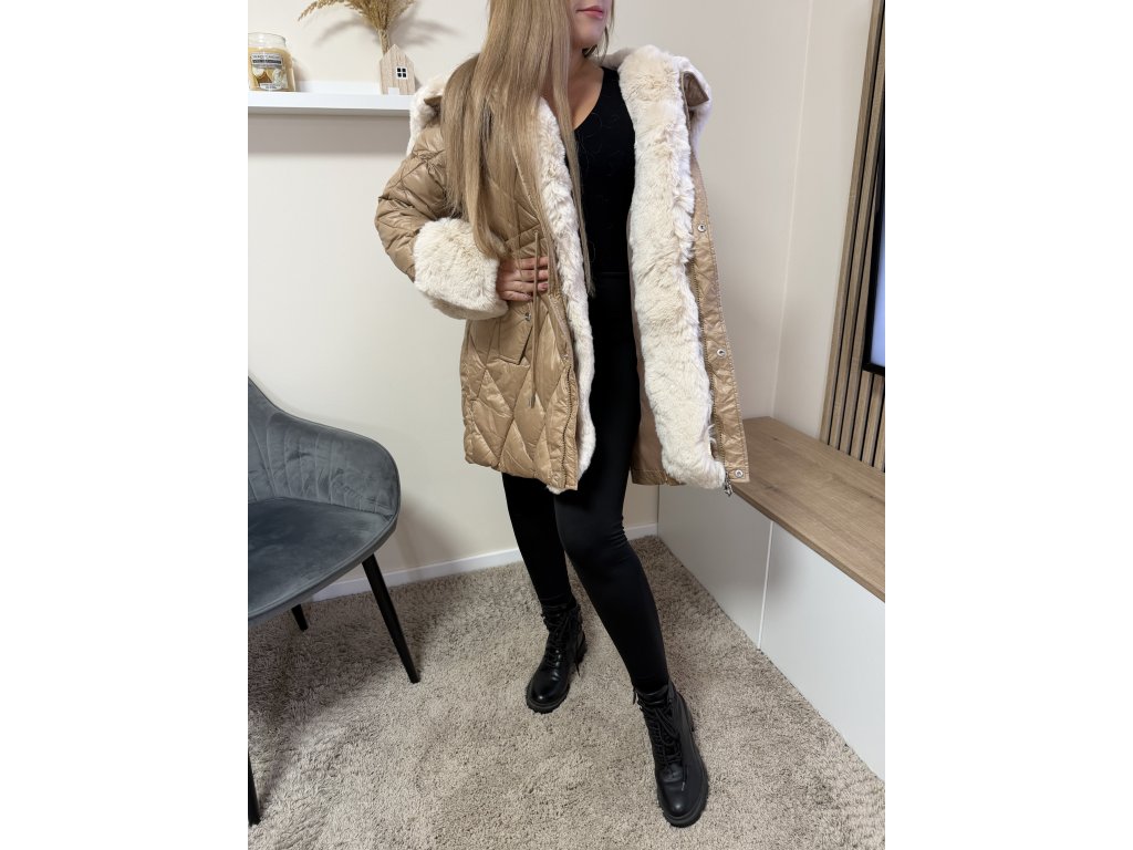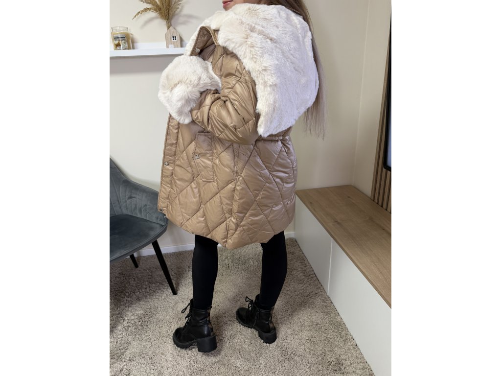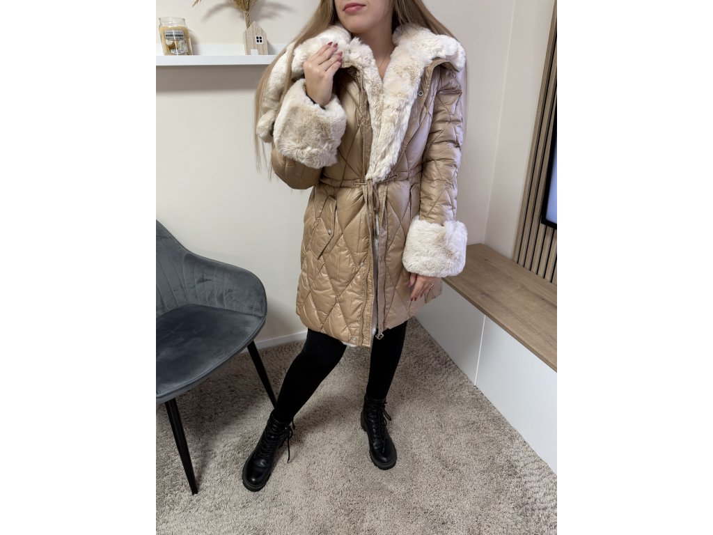 Bunda Elisa zaujme prešívaným vzorom a výraznou kožušinovou aplikáciou na kapucni a rukávoch. Je hrejivá, moderná a ľahko sa kombinuje s elegantným aj ležérnym outfitom.