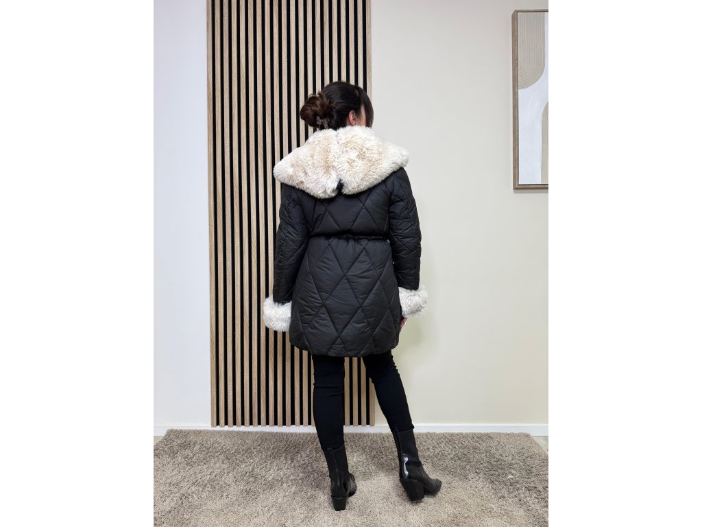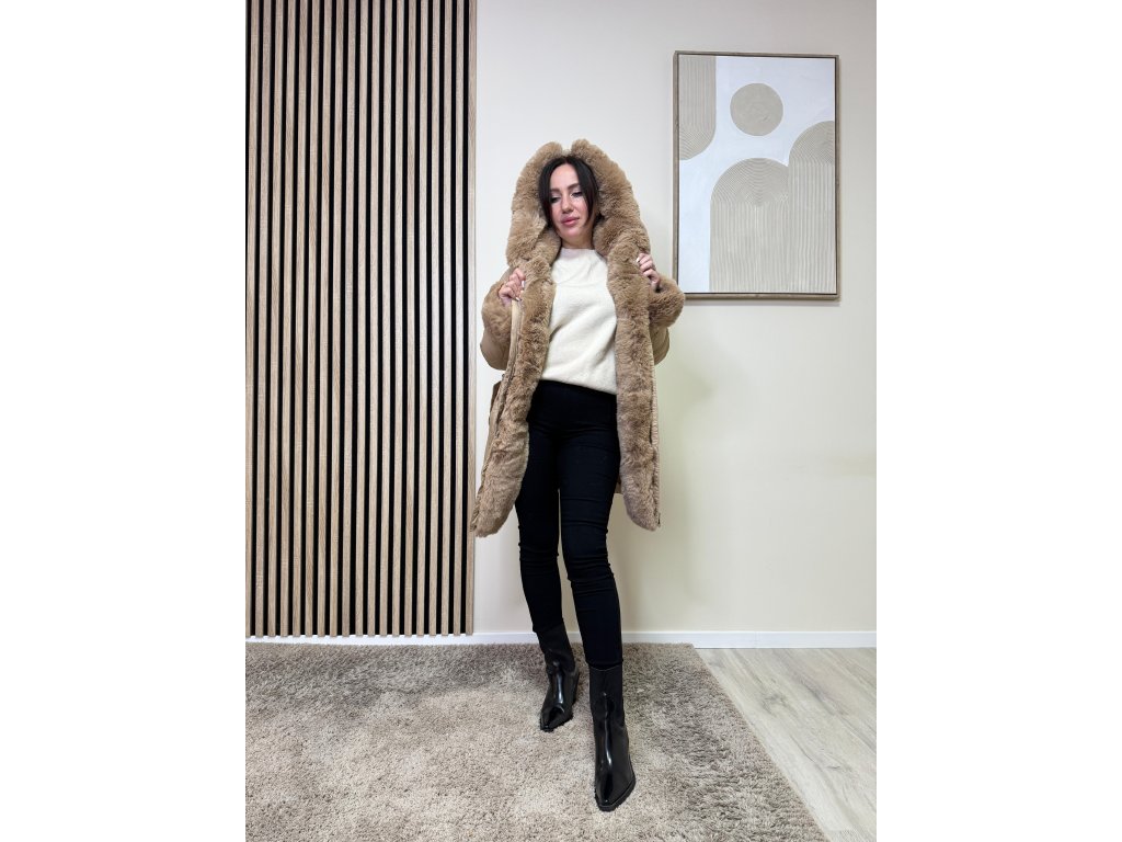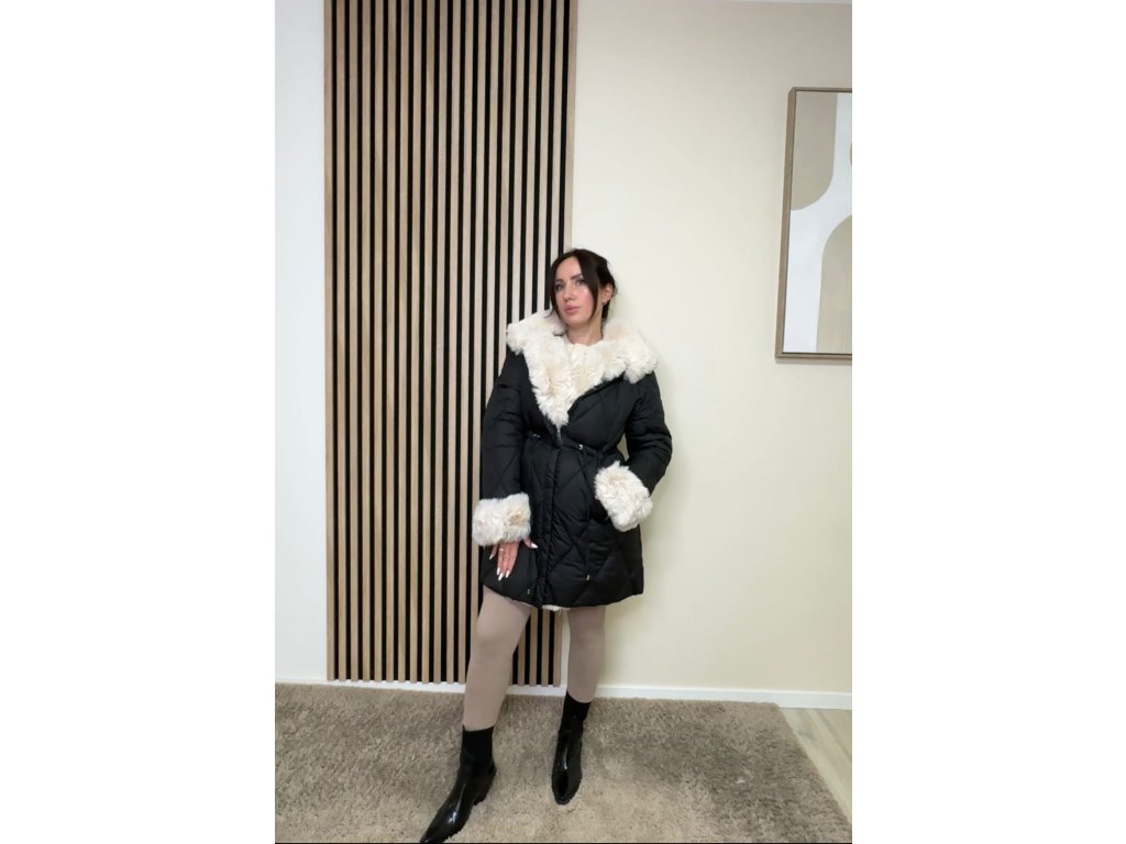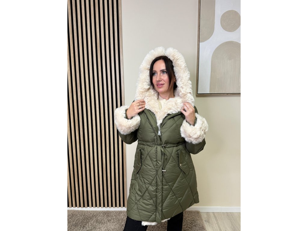 Má praktickú kapucňu, bočné vrecká, bohatú kožušinu a sťahovanie v páse.