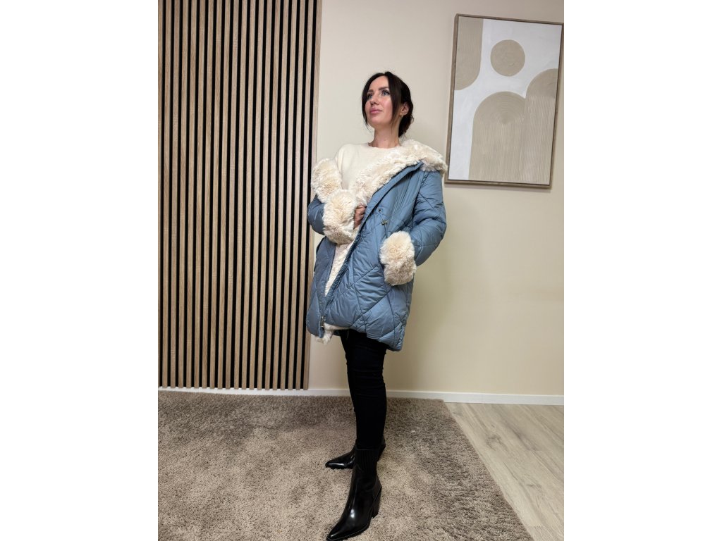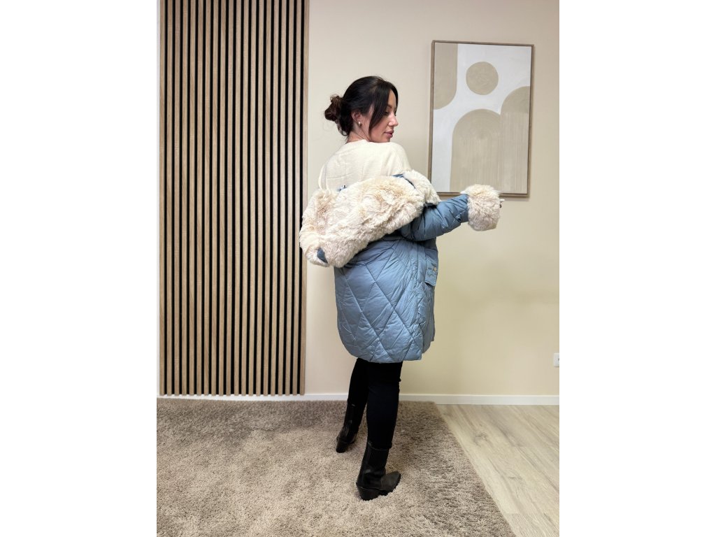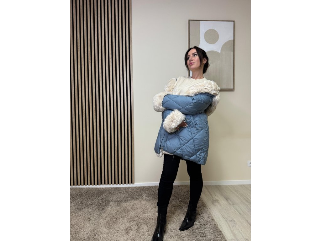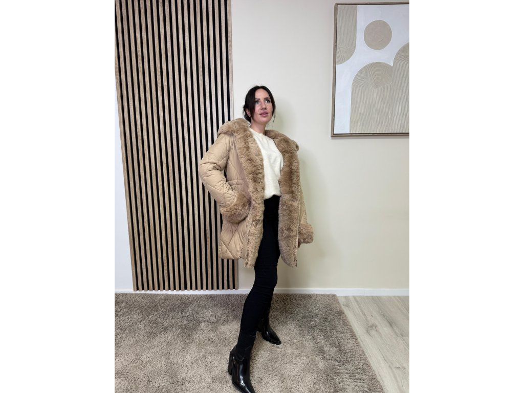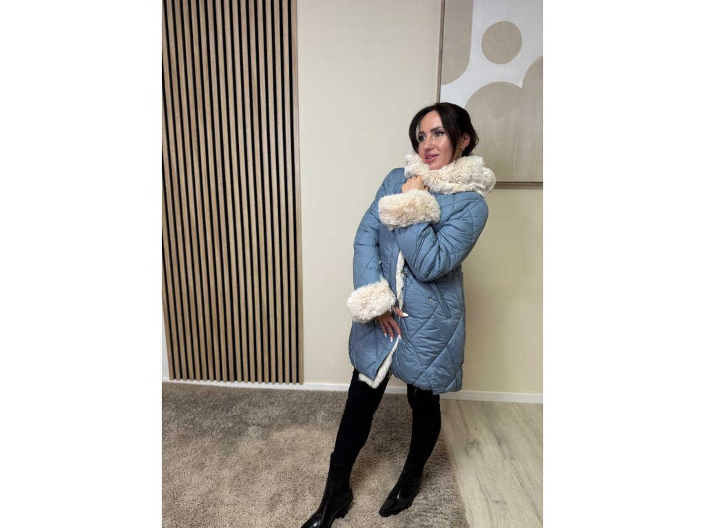 Má praktickú kapucňu, bočné vrecká, bohatú kožušinu a sťahovanie v páse.
